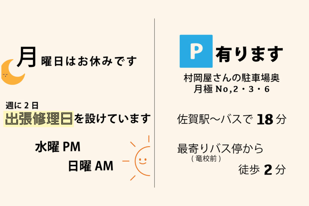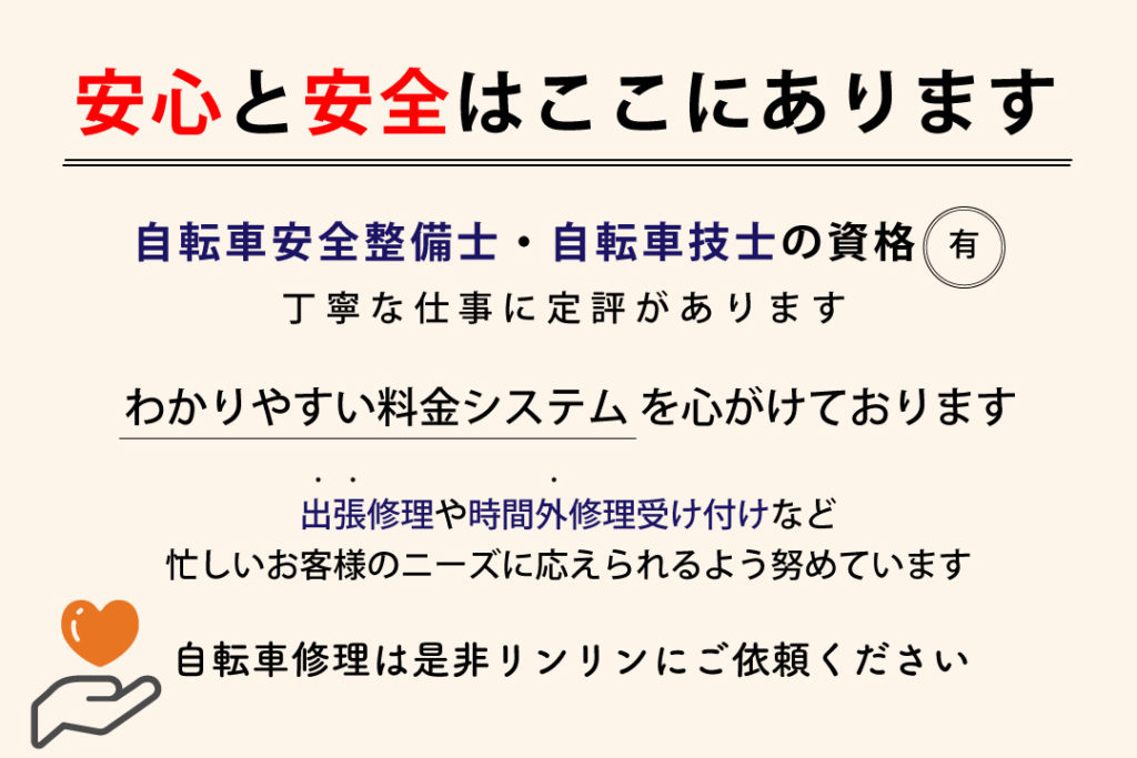 サイクルライフショップ・リンリン店主:久保 駿介自転車技士・自転車安全整備士定休日:月曜(+不定休)営業時間:11:00〜19:00出張修理日:水曜午後14:00〜19:00 日曜午前9:00〜14:00自転車の修理はお任せください